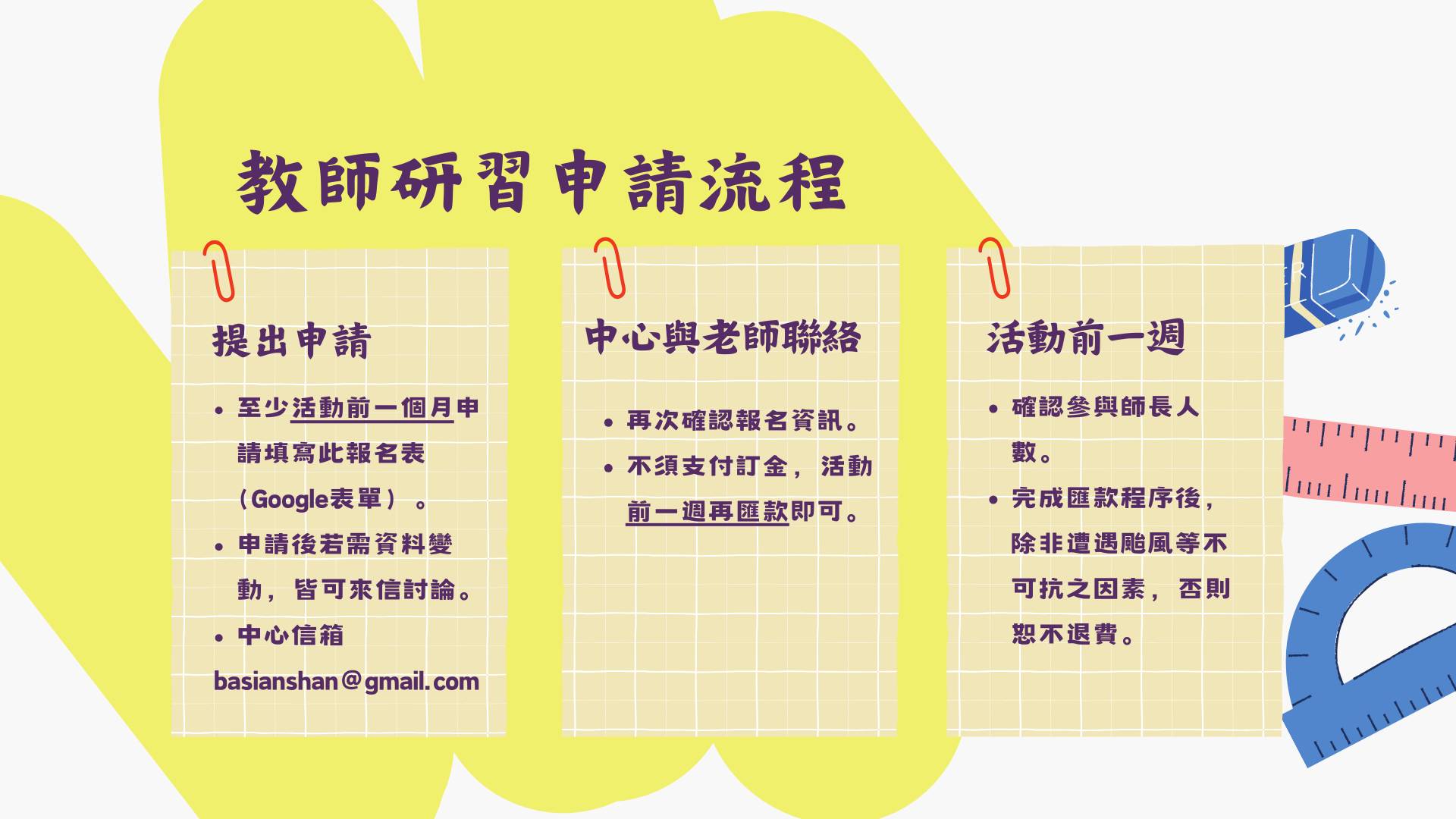 若想申請活動,請於活動日至少1個月前填寫google表單:https://forms.gle/nuVtuXeRZxfGyHkM6