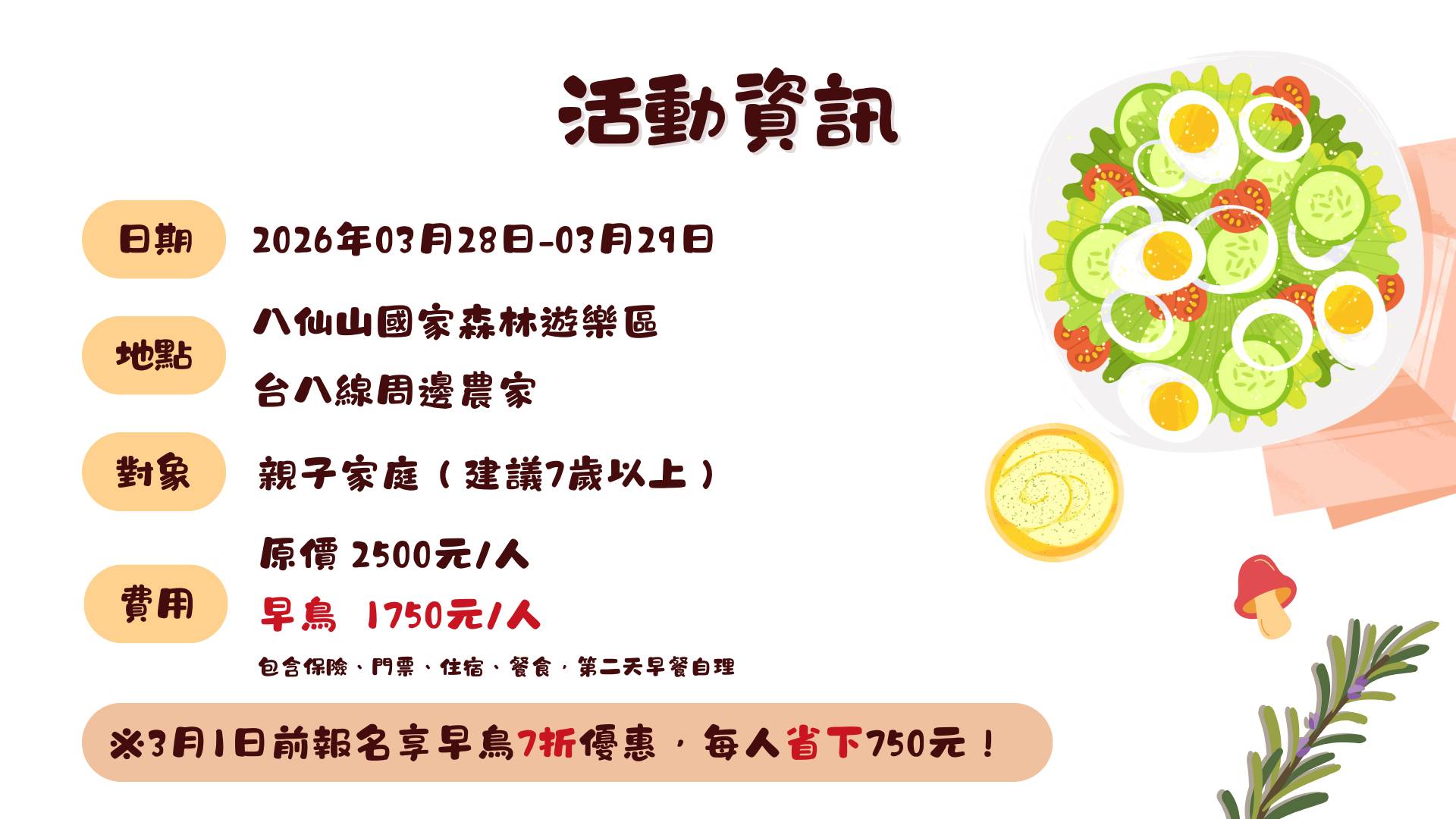 早鳥7折優惠:1750元/人