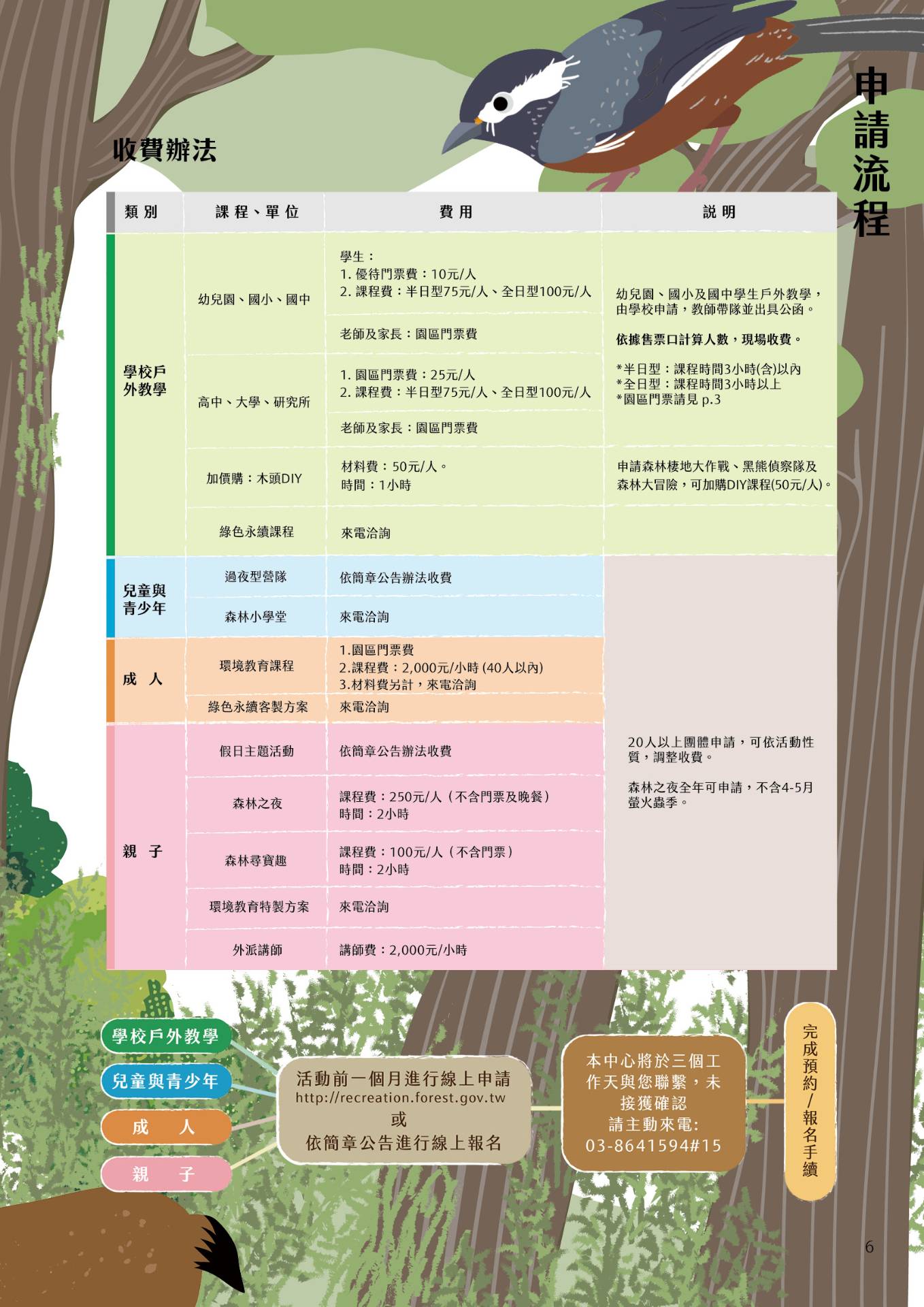 本中心提供20人以上及120人以下學校戶外教學「環境永續課程」客製化服務,並配合學校教學課程,提供2~4小時之環境教育解說及生態大地遊戲活動。若 貴校來訪人數超過120人,建請分梯次參與本活動,若有任何疑問請洽本中心教育推廣組03-864-1594#15,將有專人為您服務。