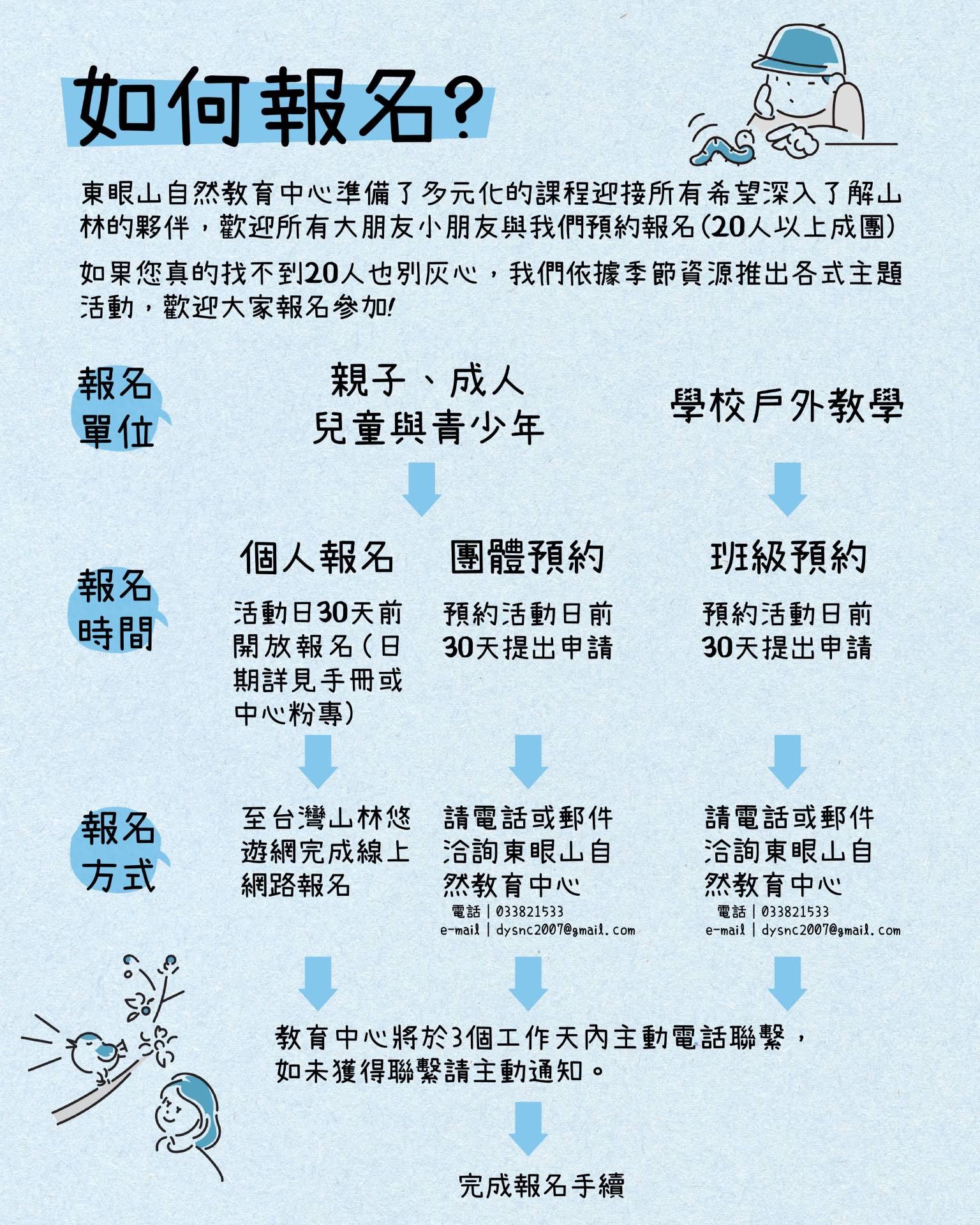 請至「自然教育」→「舉辦地點」→下拉選擇「東眼山自然教育中心」按確定→「課程類型」→下拉選擇「戶外教學」/「主題活動」/「專業研習」按確定。 依照對象以及時間需求選擇課程,於課程介紹頁面點選「報名」,填寫資料即可申請,或可致電03-3821533洽詢。