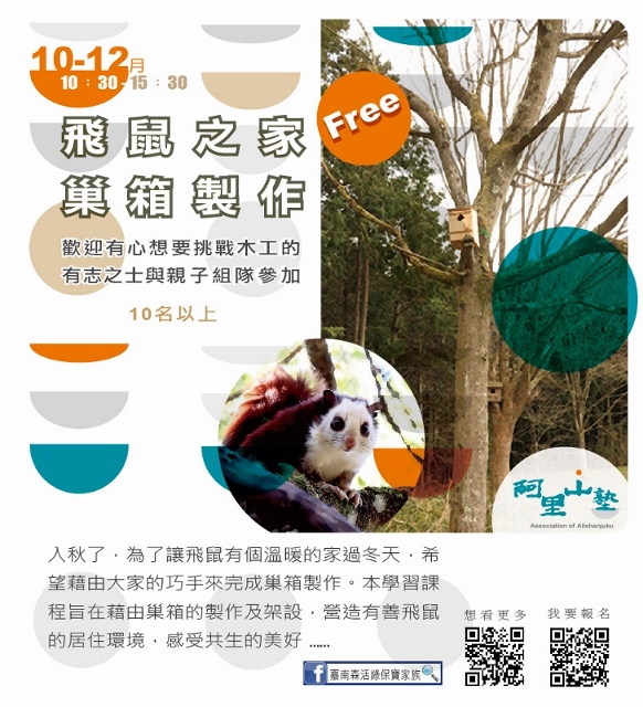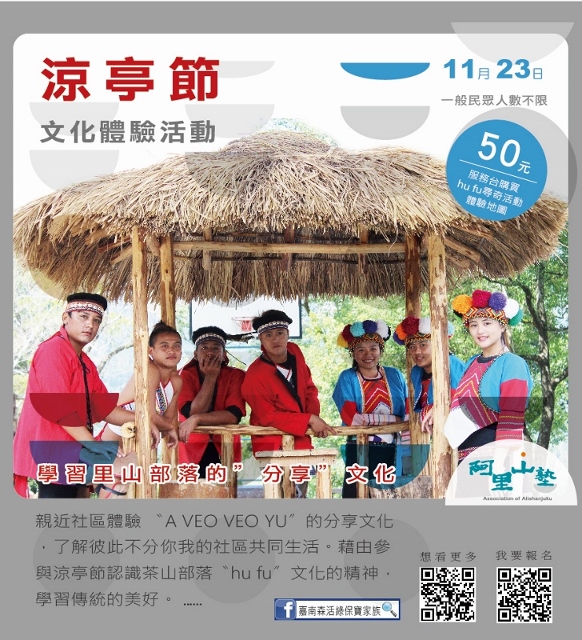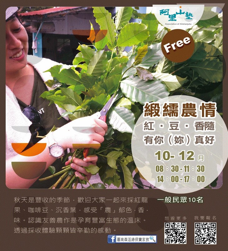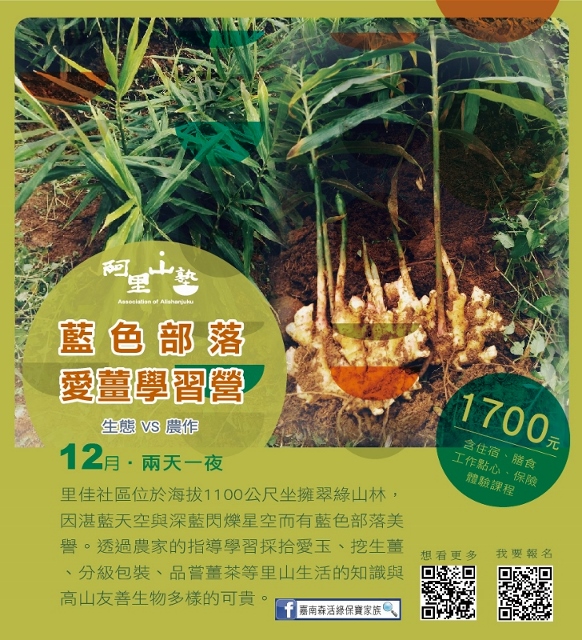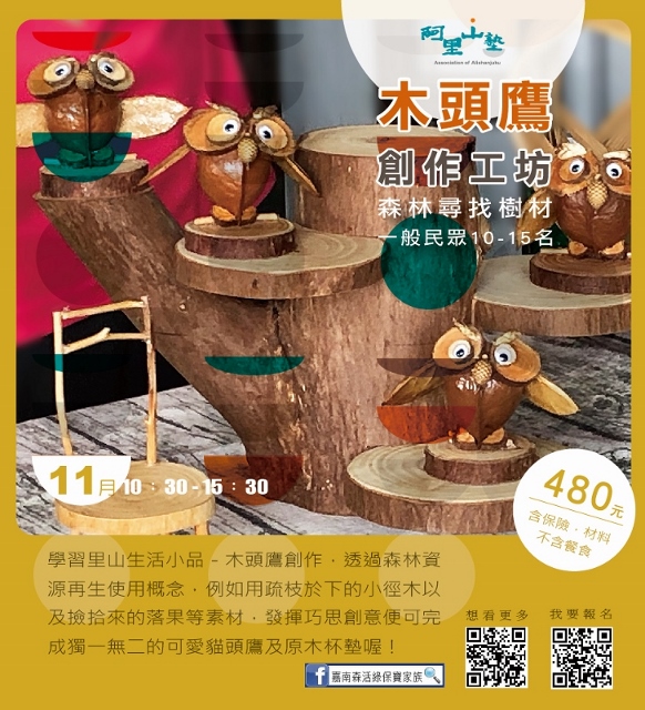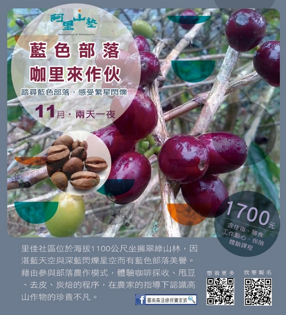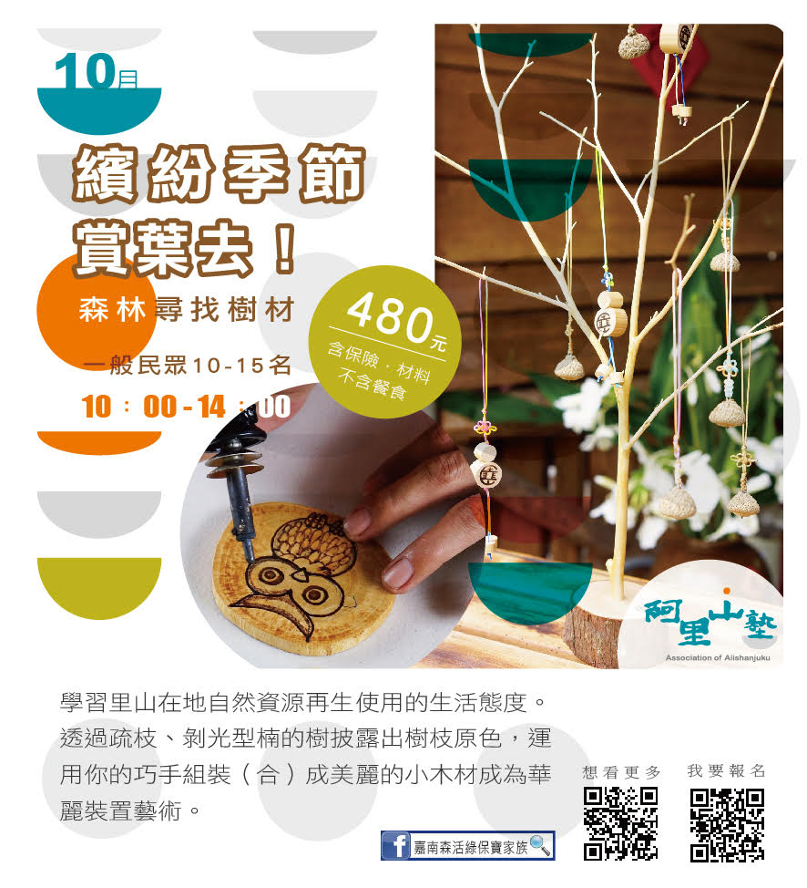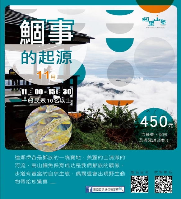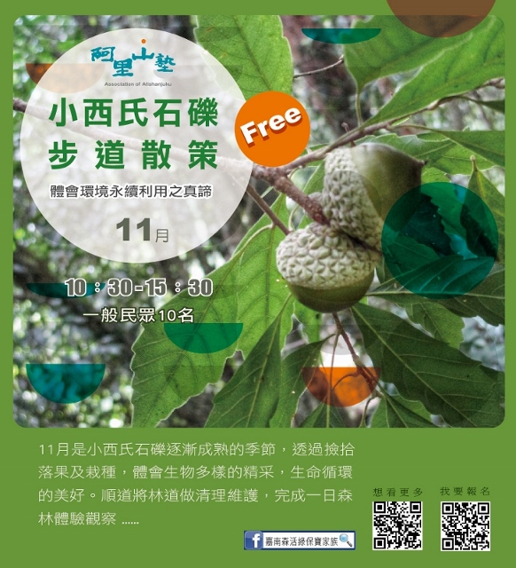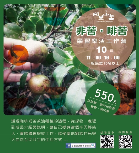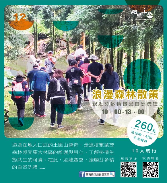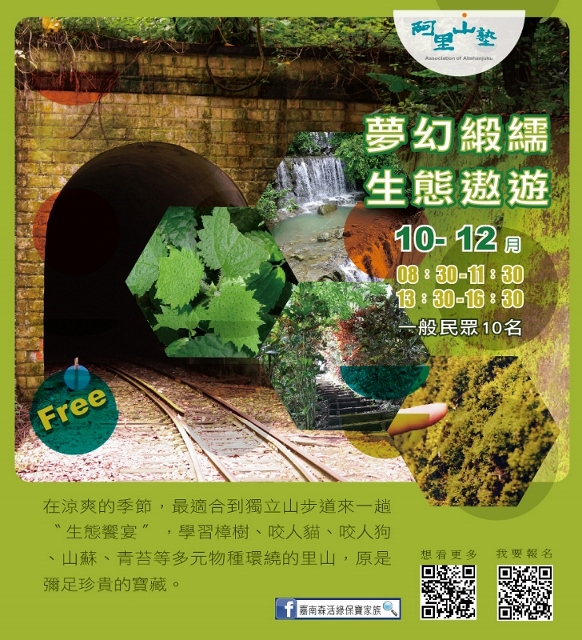 林務局嘉義林管處與阿里山地區的茶山、草山、山美、公興、緞繻及里佳等6個社區合作,自10月底至12月底,推出13種阿里山塾體驗活動,邀請大家來體驗阿里山不同海拔的山村生活與生態。「嘉南森活綠保寶家族」粉絲專頁告訴您更多活動訊息!(https://www.facebook.com/Greenforestry/)