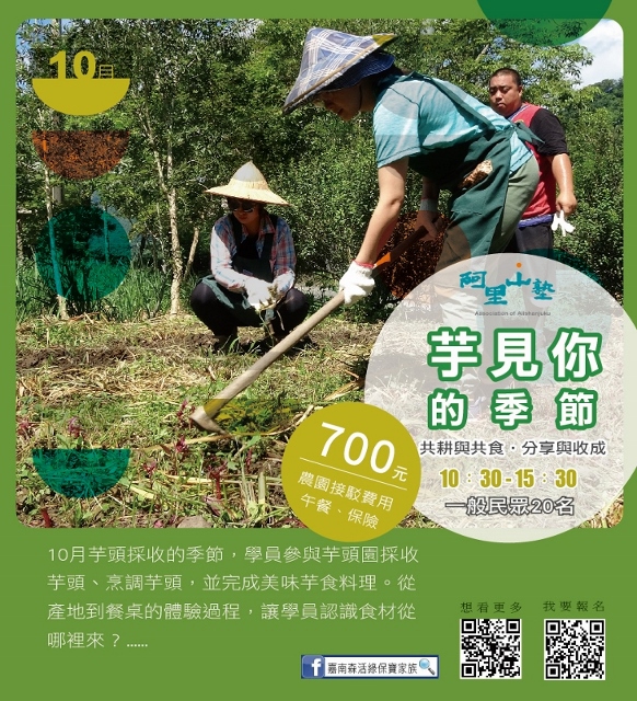 嘉義林管處張岱處長表示,林務局近年來推動山村綠色經濟永續發展計畫,以追求社會與自然和諧共處的里山倡議精神,輔導山村發展林下經濟、友善農業、生態旅遊等兼顧生態、生產、生活的永續發展模式。嘉義林管處自去年起,盤點阿里山地區部落與社區的里山生活年曆,配合山村生活的節奏,於今年10月底起,優先推出6個社區13種體驗活動,開辦阿里山塾,建立都市與山村交流的平台,提供一般民眾參與山林生活與工作的機會,歡迎家庭團體,親朋好友一同報名參加,感受隨著四季脈動的生活智慧與步調。更多活動訊息請至「嘉南森活綠保寶家族」粉絲專頁查詢!(https://www.facebook.com/Greenforestry/)