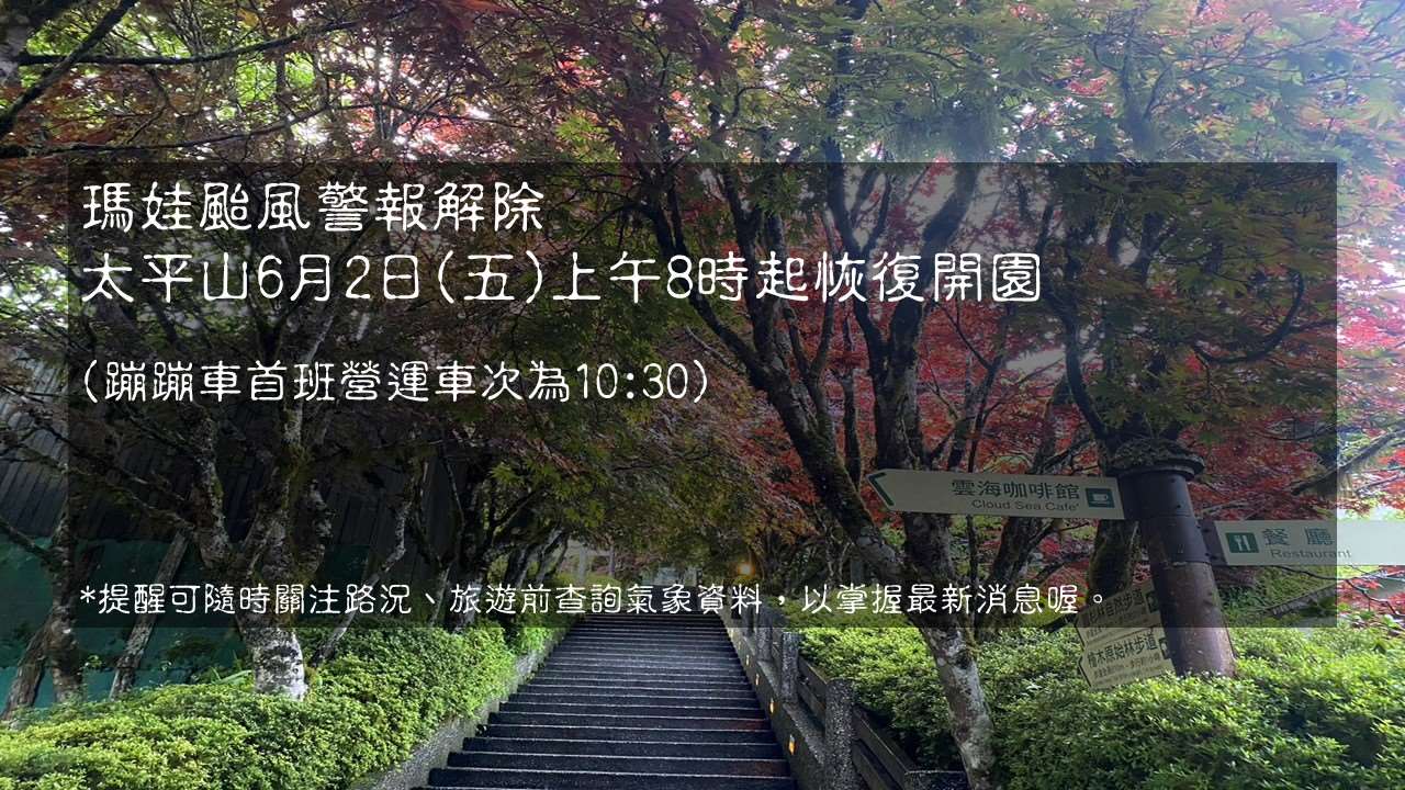 受瑪娃颱風外圍環流影響,太平山國家森林遊樂區自5月31日起預警性休園,林務局羅東林管處經積極投入人力進行區內環境及各項設施檢視及維護後,訂於112年6月2日(星期五)上午8時起恢復開園,蹦蹦車首班營運車次為10:30。羅東林管處提醒民眾可以隨時關注公路總局網站(https://www.thb.gov.tw/),以掌握最新消息,也提醒旅遊前查詢氣象資料,氣候不佳時,建議減少戶外活動;太平山最新消息可上官網 (http://tps.forest.gov.tw) 、台灣山林悠遊網(http://recreation.forest.gov.tw/)、FB粉專(http://www.facebook.com/tps100.forest/)查詢。