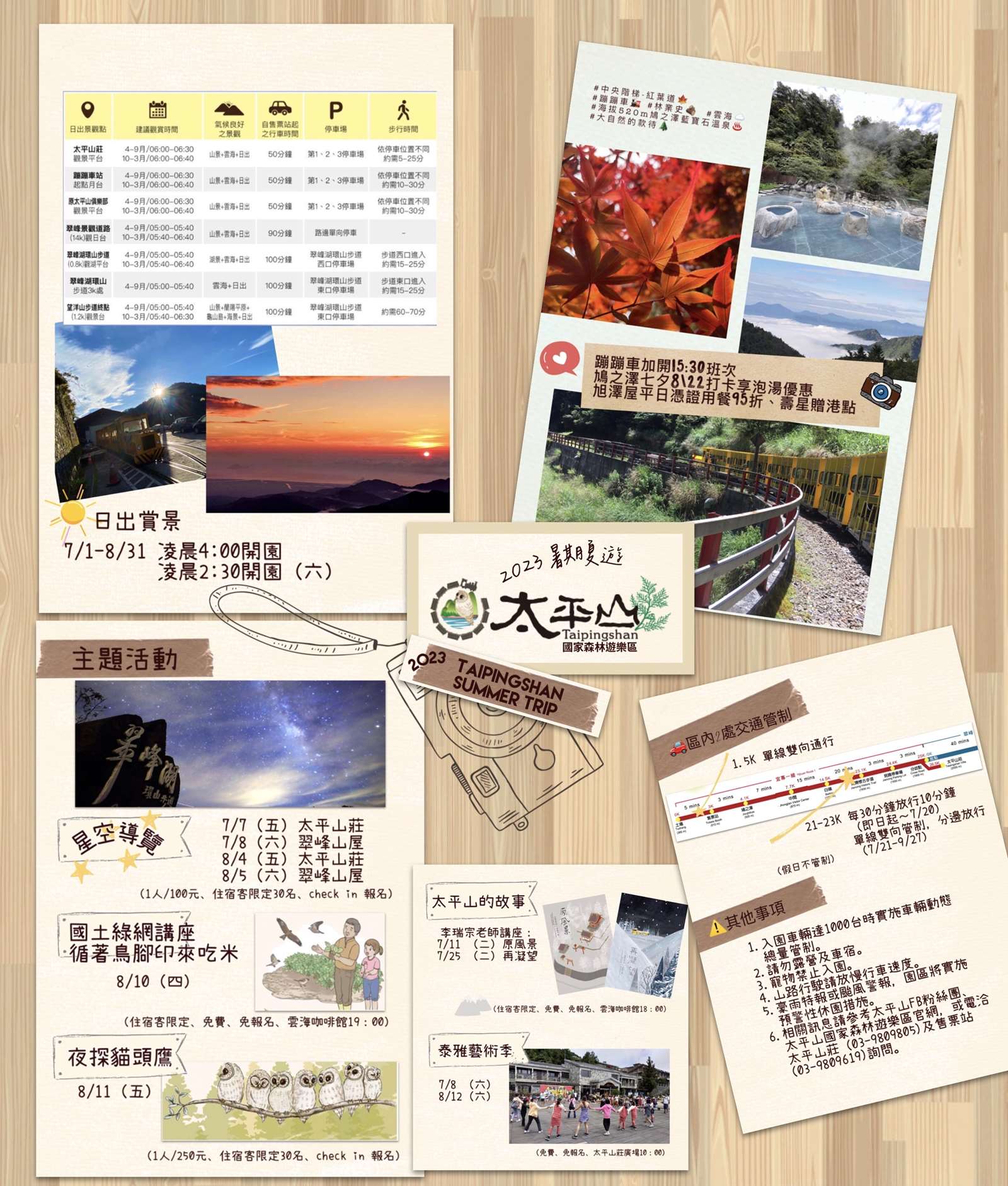 太平山國家森林遊樂區推廣生態旅遊,於暑假期間配合遊樂區特色安排系列主題活動,遊客可把握機會一睹太平山夏夜星光閃亮、瞭解國土綠色網絡保育計畫、夜訪森林裡的夜行性猛禽-灰林鴞、深入瞭解太平山的過去現在及原住民與自然環境關係之傳統的生活智慧。
