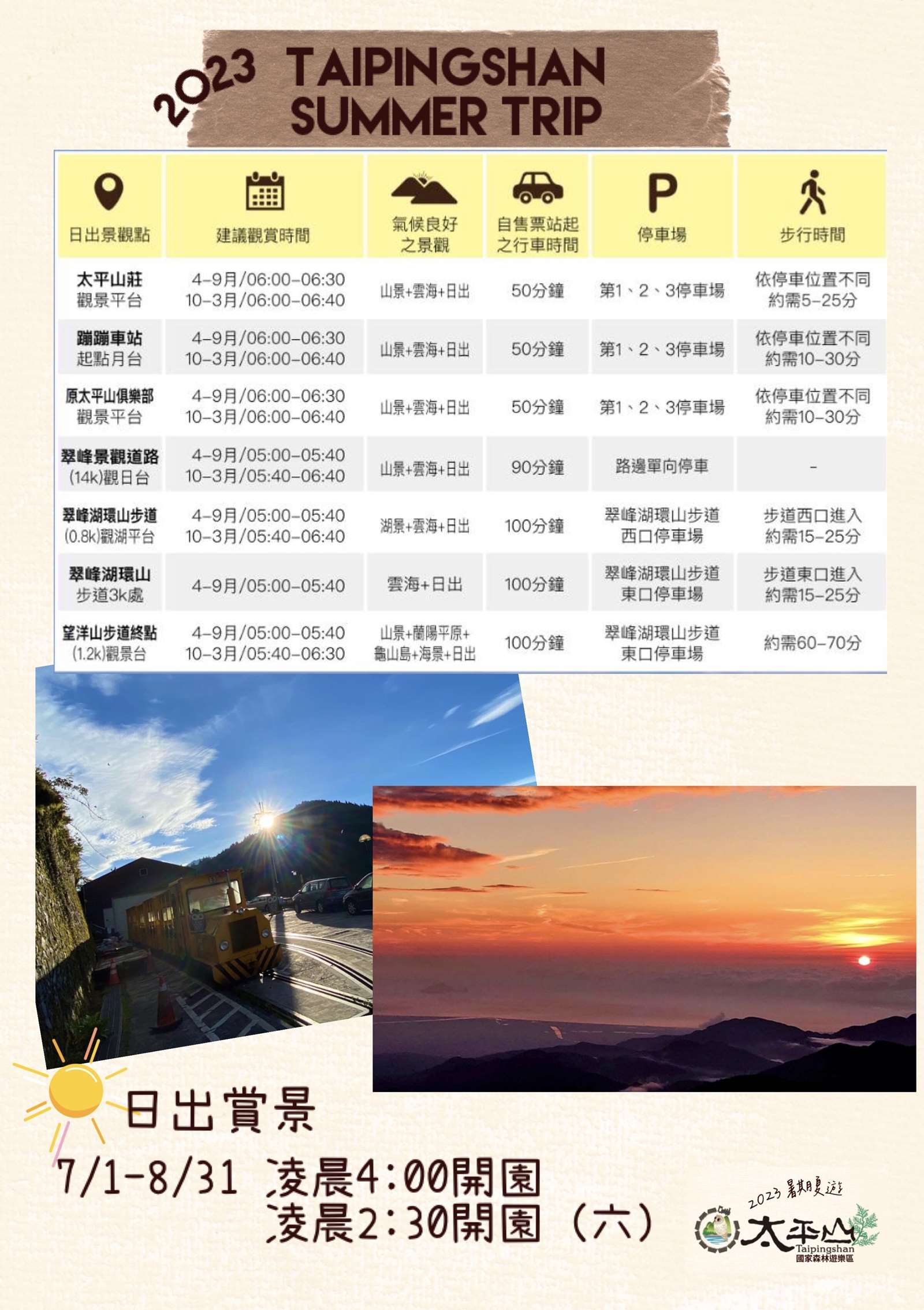 仲夏來臨,位處海拔2,000公尺的太平山國家森林遊樂區,為民眾規畫避暑踏青的好所在,林業及自然保育署宜蘭分署邀請大家一起來,呼吸森林芬多精,享受自然美景。太平山國家森林遊樂區各觀日點時間約在5點至6點之間,為讓遊客能趕在天明之前,欣賞日出之美,遊樂區在7月1日至8月31日暑假期間,每日於凌晨4:00開園,期間每逢周六特別提前至凌晨2:30開園。歡迎暑假到太平山迎看日出迎曙光。