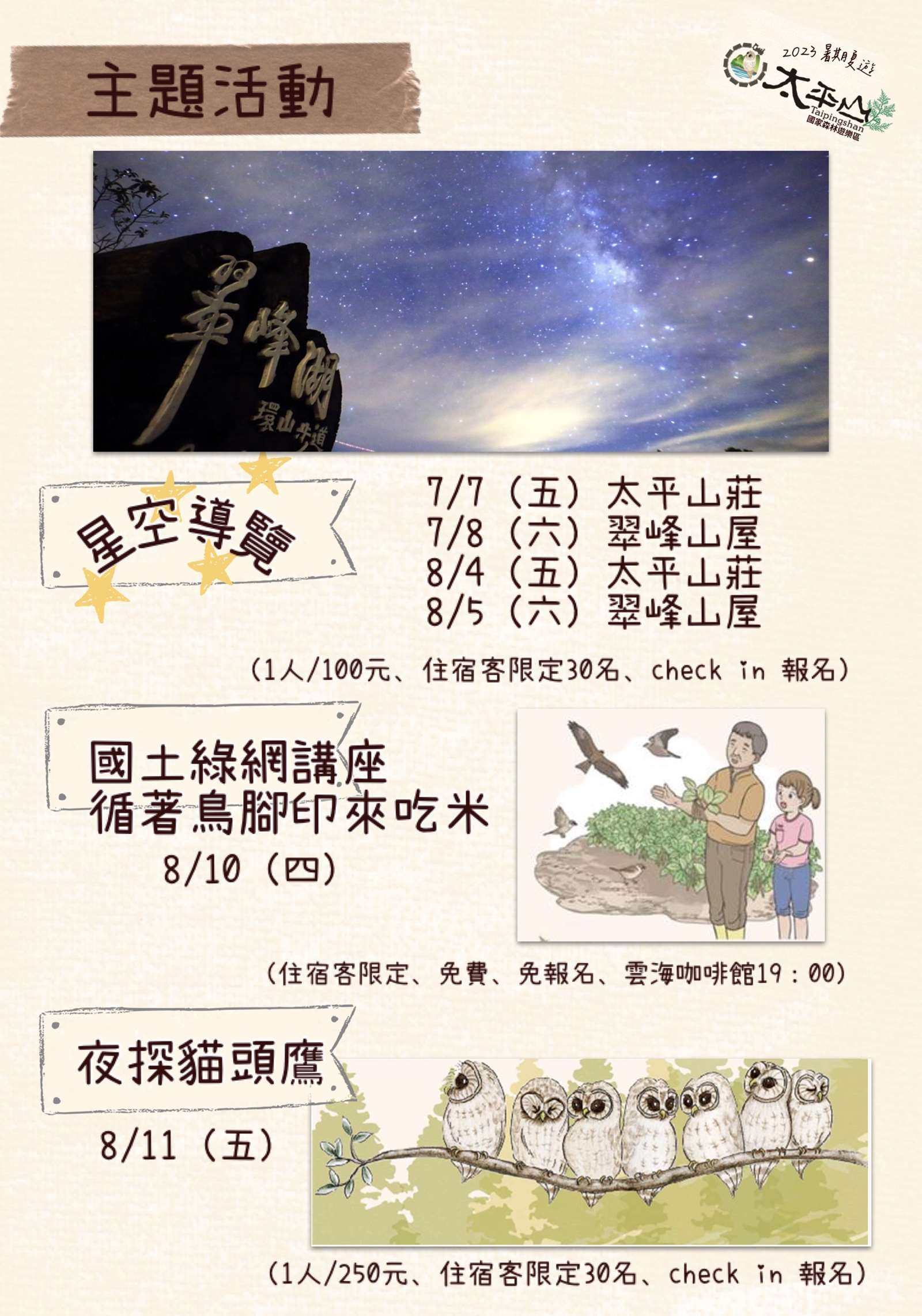 1. 星空導覽/觀星活動: 7月7日(五)、8月4日(五)太平山莊;7月8日(六)、8月5日(六)翠峰山屋,1人100元,限定30名,入住時報名。
