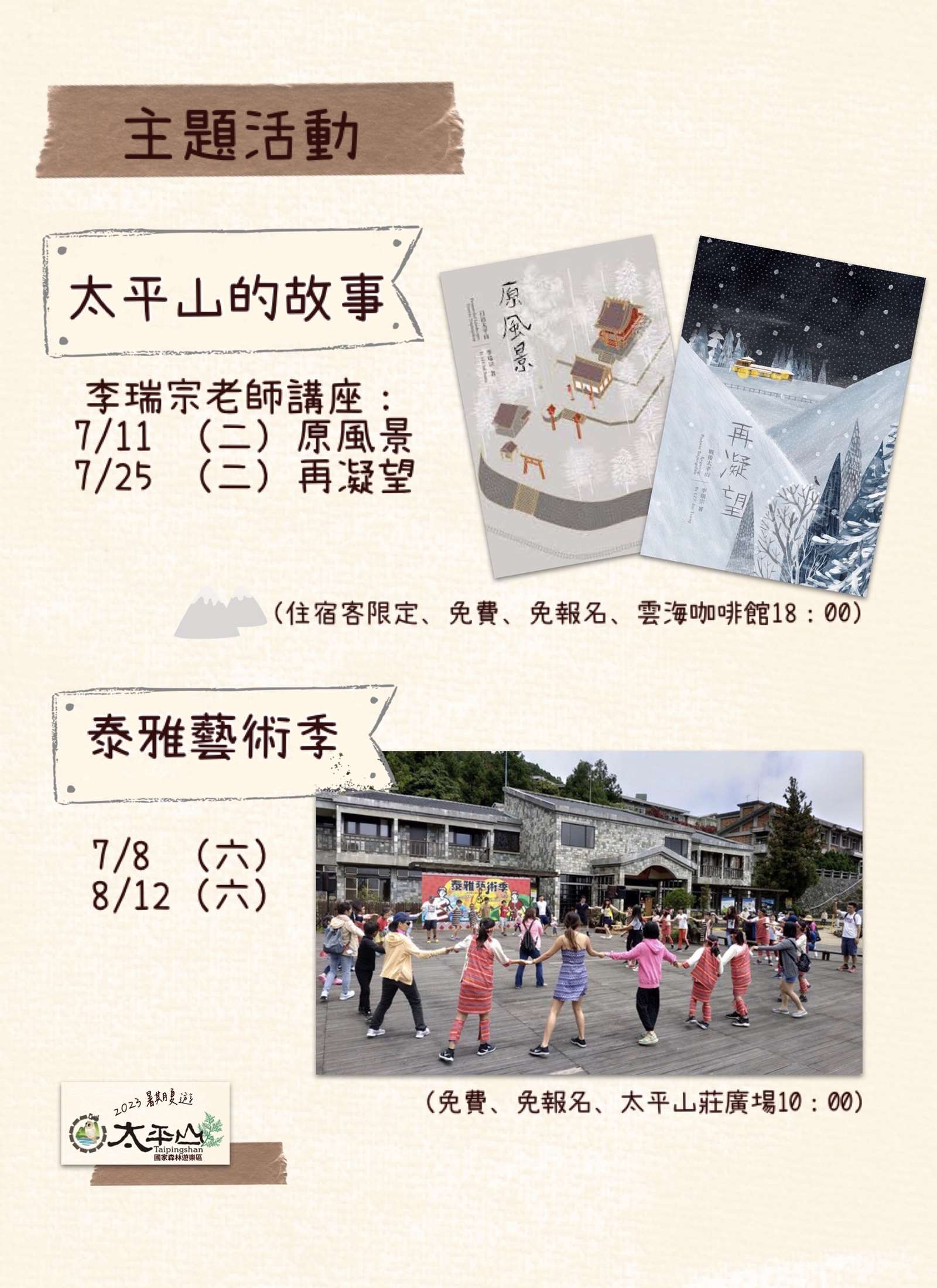泰雅藝術季活動於7月8日(六)、8月12日(六)10:30在太平山莊廣場辦理,免收費免報名,歡迎遊客參加。觀星活動、綠網講座、夜探貓頭鷹、太平山的故事講座,各場次活動供住宿遊客參與,如下: