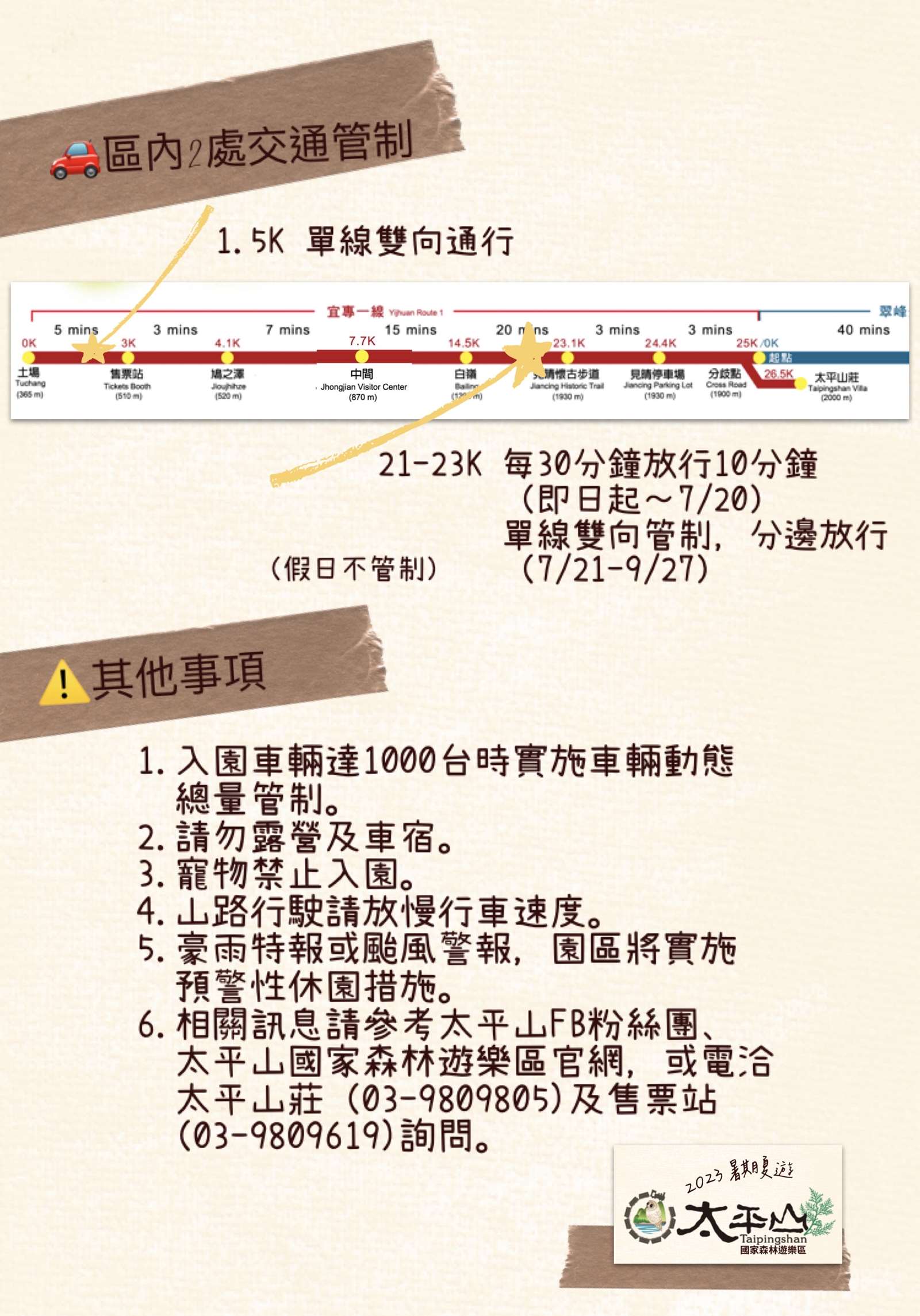 六、 考量太平山聯外道路較長,為維民眾遊憩安全,如中央氣象局發布豪雨特報或颱風警報,園區將實施預警性休園措施。