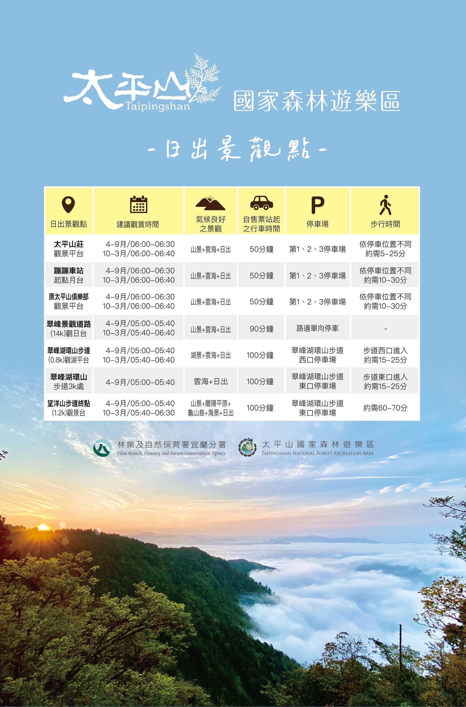 元旦當日若氣候良好,林業及自然保育署宜蘭分署推薦在太平山欣賞日出的景點有7處:(1)太平山莊觀景台、(2)蹦蹦車車站月台、(3)原太平山俱樂部廣場欣賞「三星山日出」、(4)翠峰景觀道路14k觀景台觀賞「雲海日出」、(5) 翠峰湖環山步道0.8K觀景平台欣賞湖景日出、(6)翠峰湖環山步道3K處觀賞「雲海日出」、(7)望洋山步道觀景台觀賞「龜山朝日」。