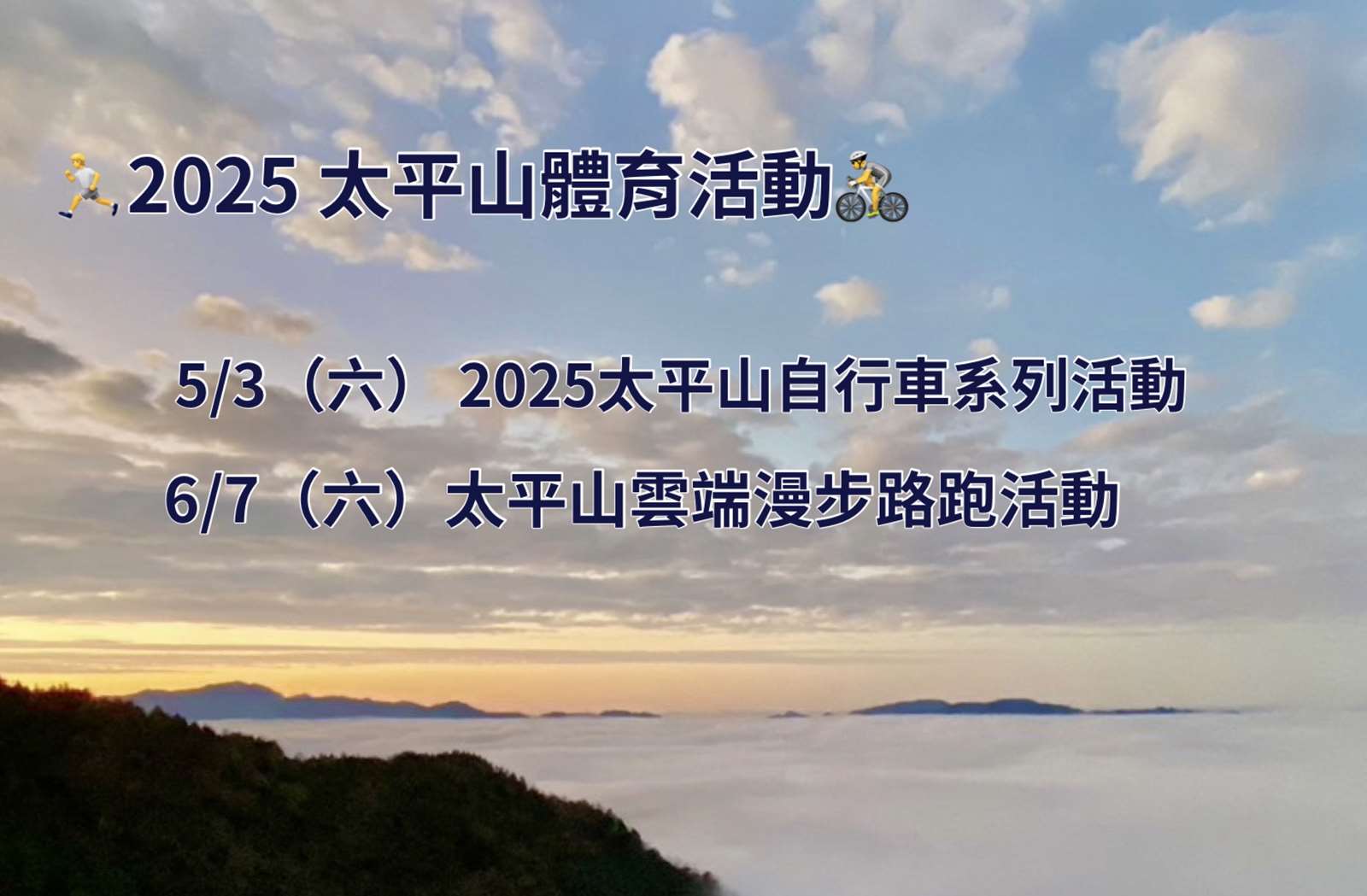 太平山是國內知名的國家森林遊樂區,有雲海、日出、蹦蹦車、溫泉、最大高山湖泊及連綿不絕的森林美景,區內海拔自365公尺一路爬升至2050公尺,除了是民眾生態旅遊、親近自然的首選地點,也是體育活動挑戰的絕佳地點。2025年體育活動受理民間團體申請,經專業委員評審後,通過2場次體育活動,分別為中華民國自行車騎士協會於114年5月3日(六)辦理「2025太平山自行車系列活動」、宜蘭縣鐵人三項協會於114年6月7日(六)辦理「2025太平山雲端漫步路跑活動」,歡迎民眾報名參加。
