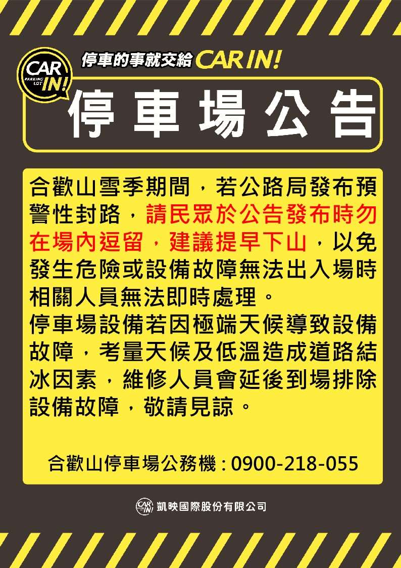 合歡山雪季期間,若公路局發布預警性封路,請民眾於公告發布時勿在場內逗留,建議提早下山,以免發生危險或設備故障無法出入場時相關人員無法即時處理。