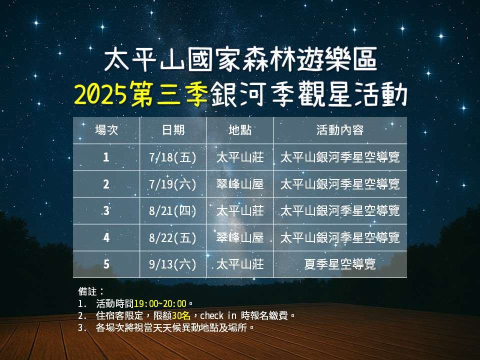 活動報名方式:當日住宿太平山的遊客,於住宿山莊櫃台辦理入住程序後,即可現場報名,限額30名, 每人報名費100元。時間原則為19:00-20:00,由專業的老師一起帶領遊客進行室內課程及室外活動。