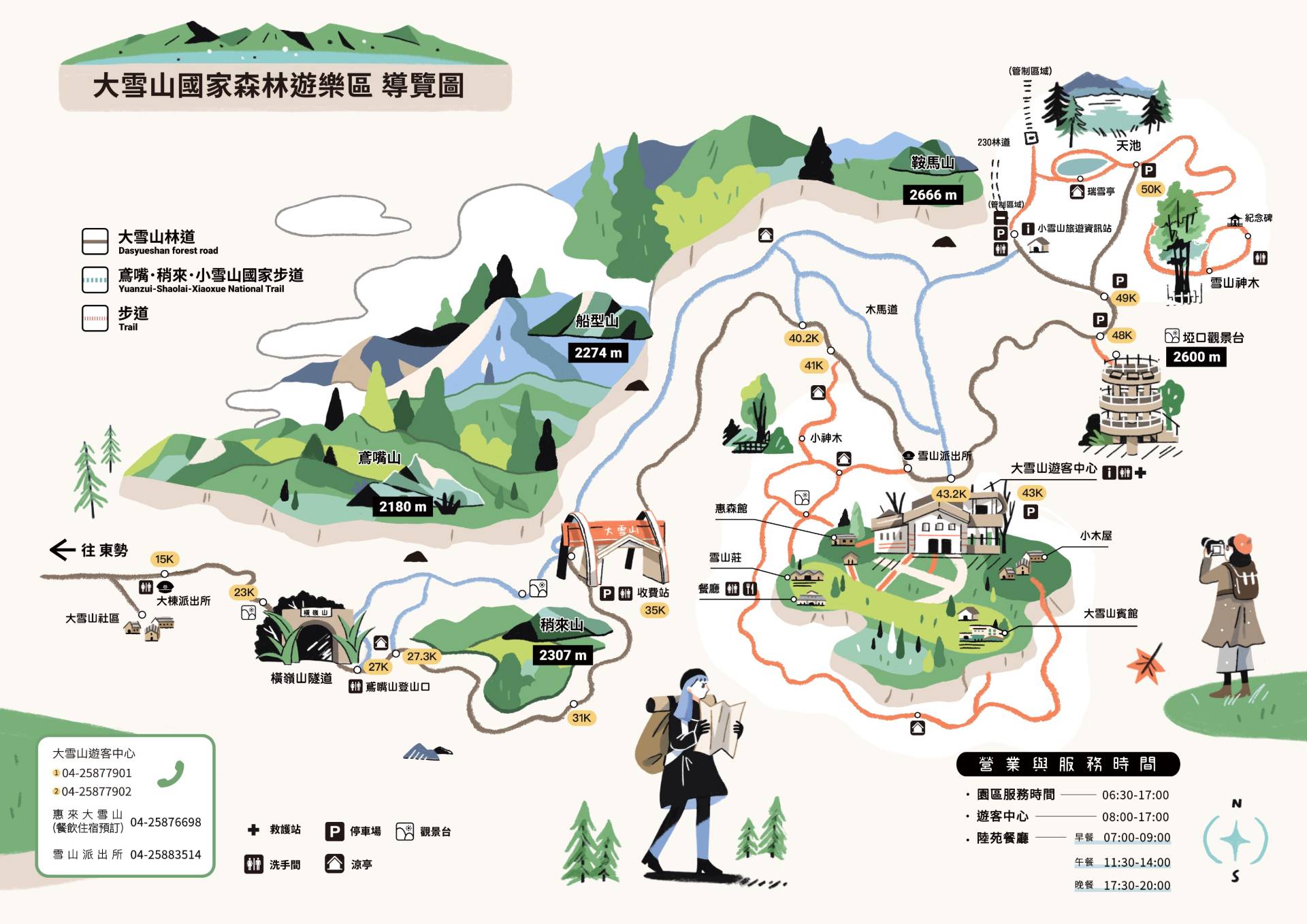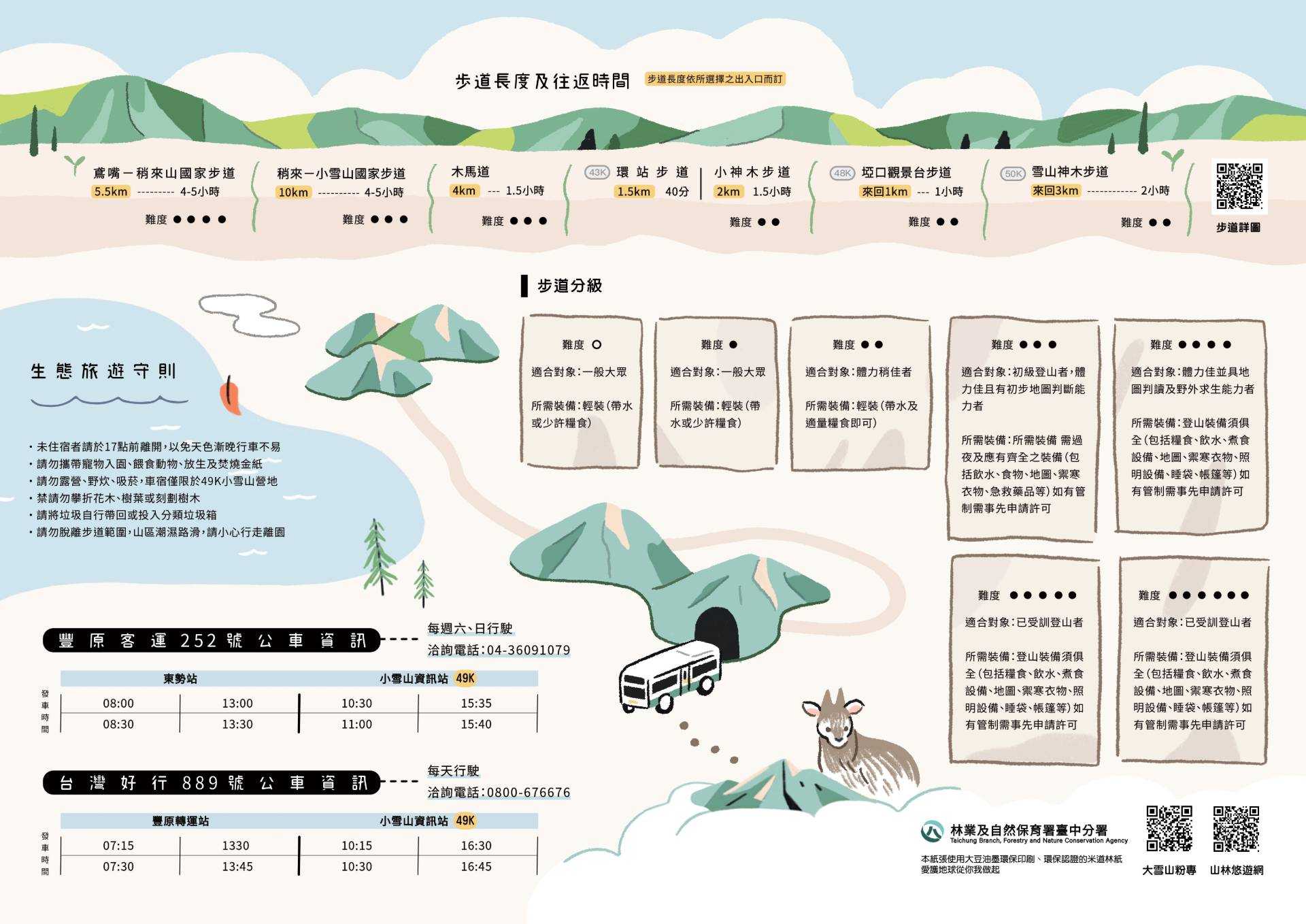 ※大雪山林道乙類客車行駛應特別注意路段:5K+200、6K+700、13K+400、15K+300、20K+800、24K+500、26K+500、28K+250、35K+900、36K+800、39K+850、44K+600、47K+500等13處。